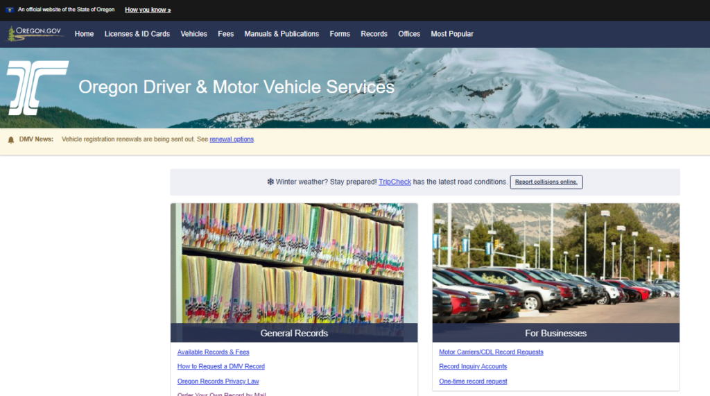 The Oregon DMV maintains multiple vehicle records, but it does not produce a unified history report like commercial services do. DMV records include: